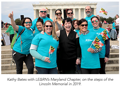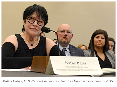 One of Bates' most important contributions was her testimony before the U.S. Congress in 2019, where she successfully advocated for the creation of the first-ever National Commission on Lymphatic Disease. The establishment of this commission marked a historic milestone in officially recognizing lymphatic diseases as a national public health priority and laying the foundation for coordinated federal research, policy guidance, and ongoing investment in improved diagnosis, treatment, and care. She will once again take on this role in 2026, leading the LE&RN Advocates Day on Capitol Hill to push for increased research funding.